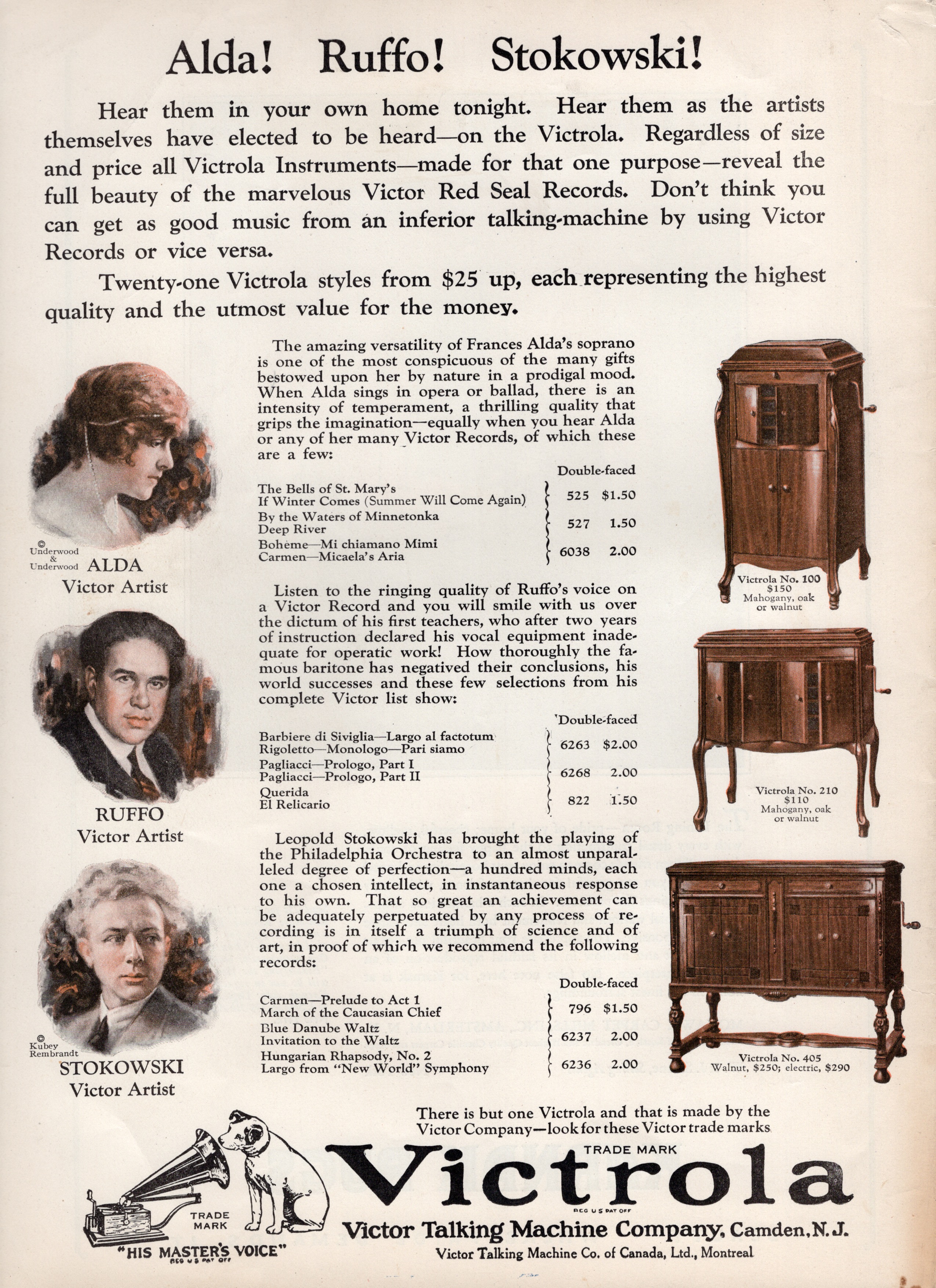Hear them in your own home tonight. Hear them as the artists themselves have elected to be heard — on the Victrola. Regardless of size and price, all Victrola Instruments — made for that one purpose — reveal the full beauty of the marvelous Victor Red Seal Records. Don’t think you can get as good music from an inferior talking machine by using Victor Records, or vice versa.