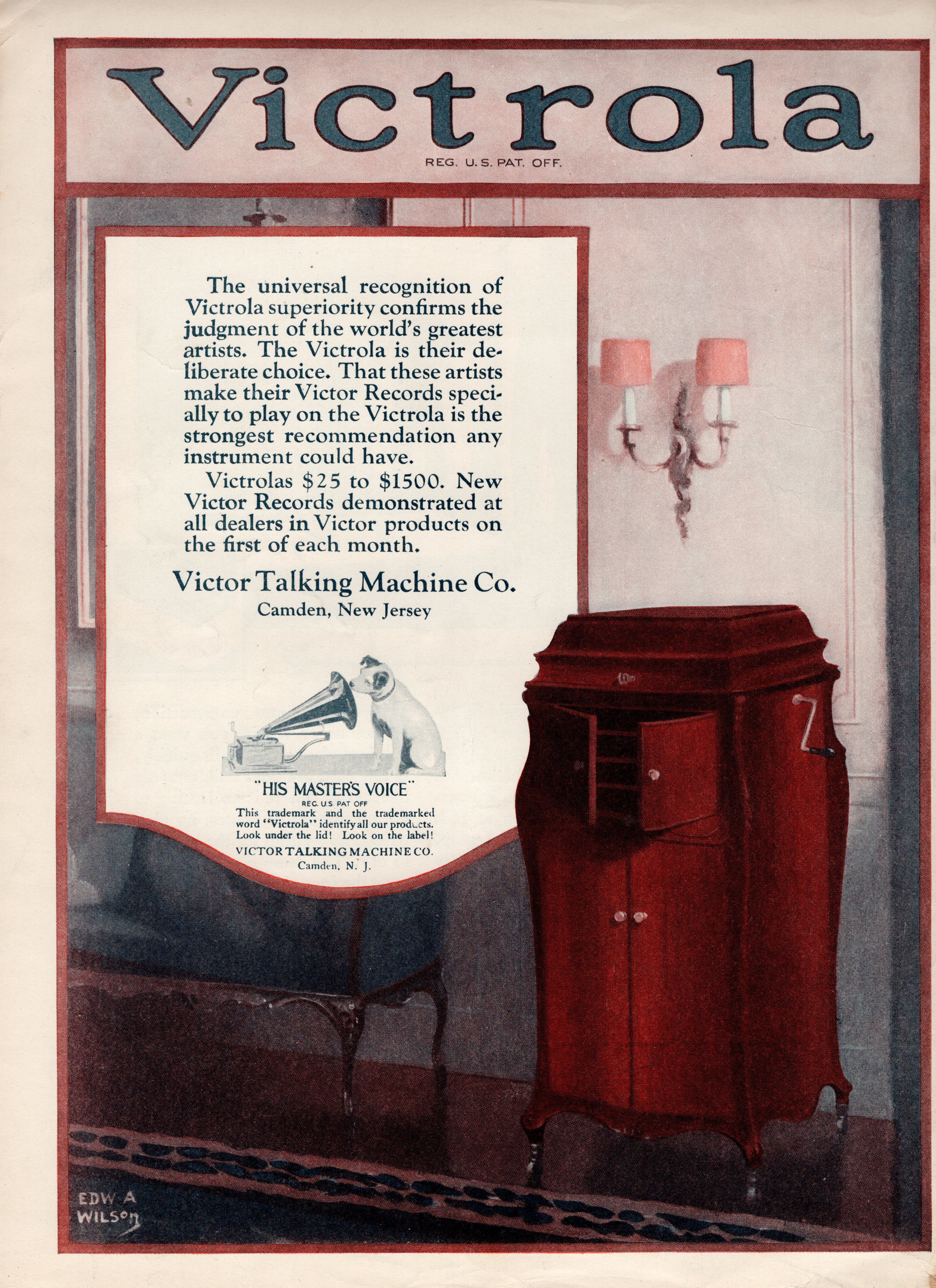Here's an ad for a 1920s Victrola record player from Victor Talking Machine Company (US) or what was later sold in 1929 to RCA.