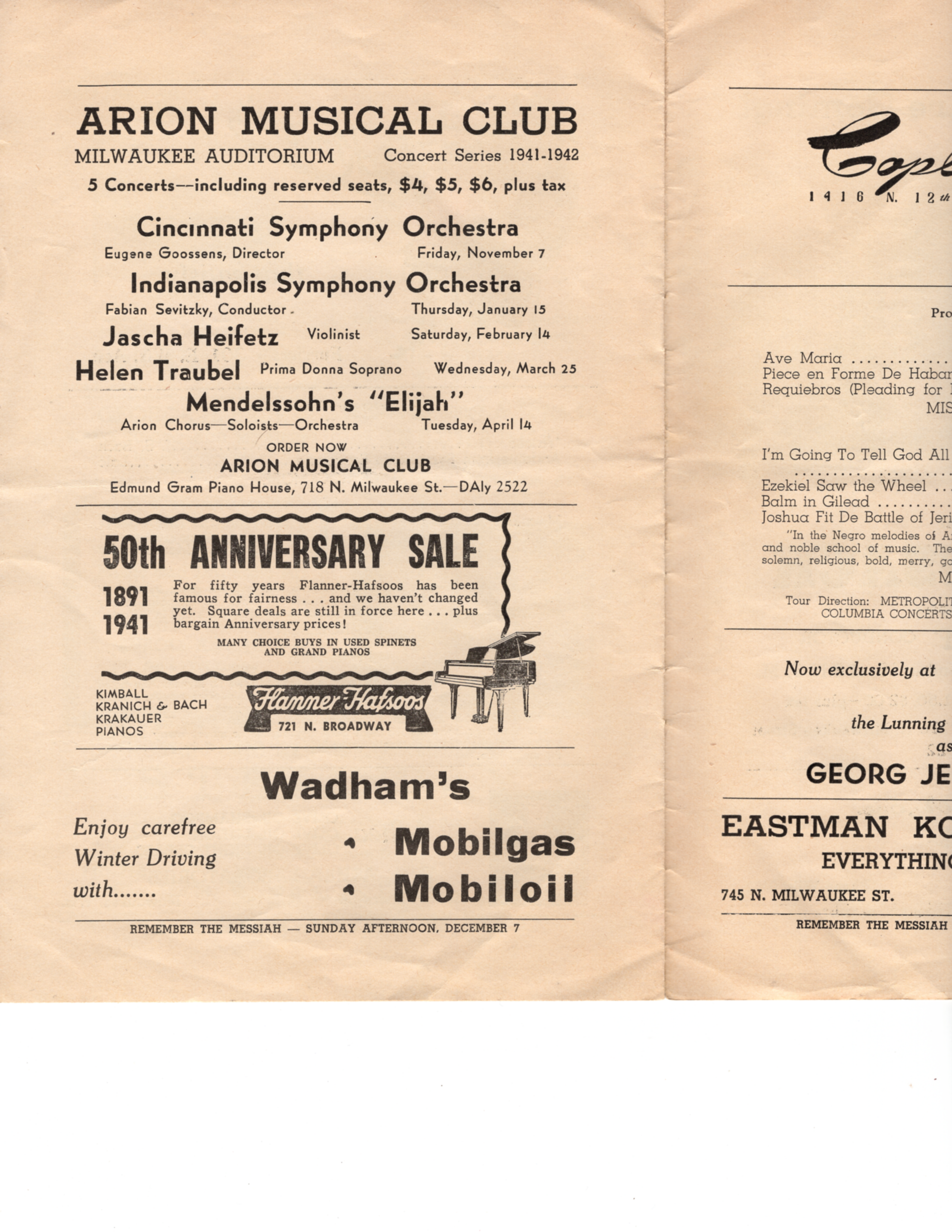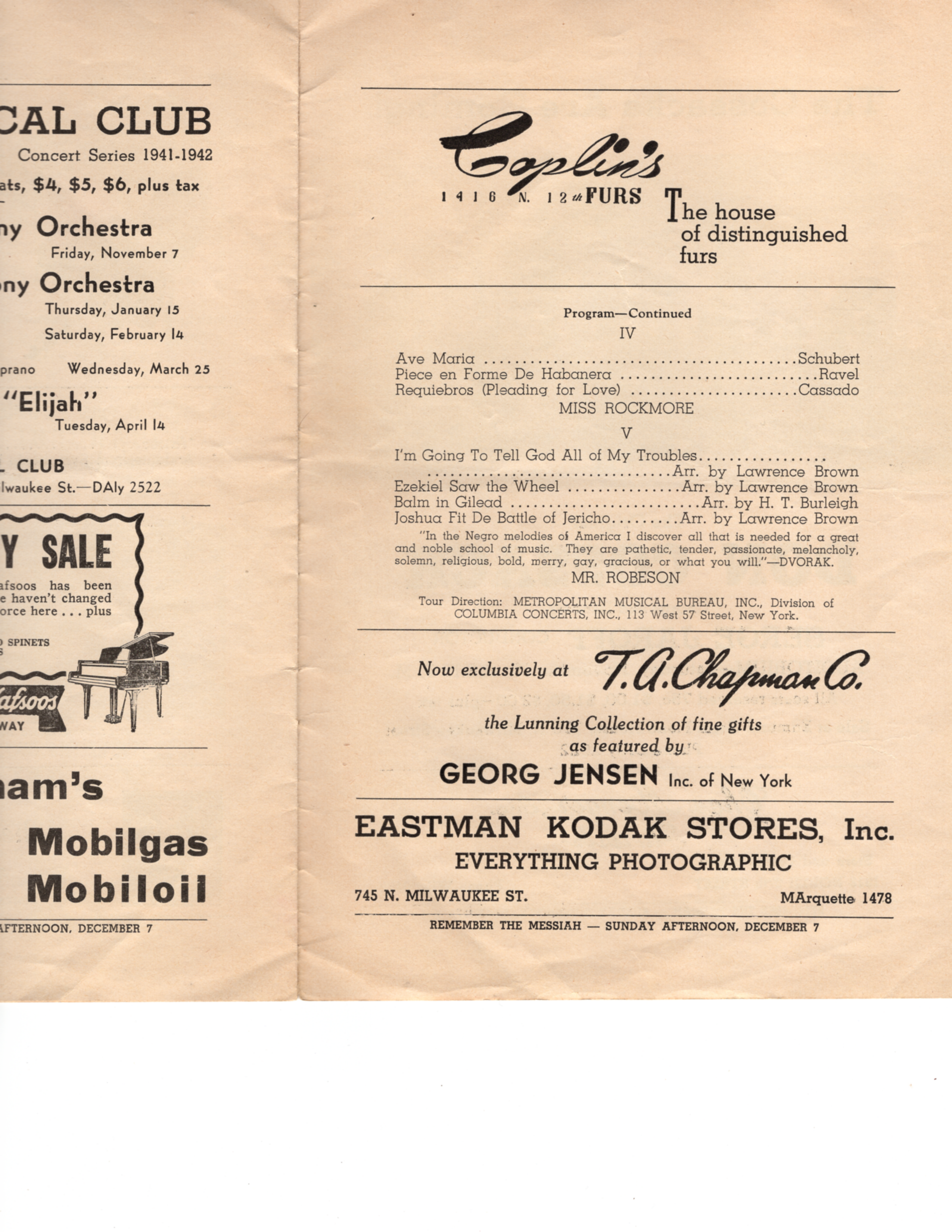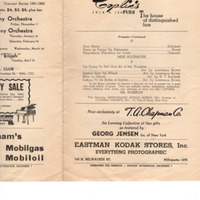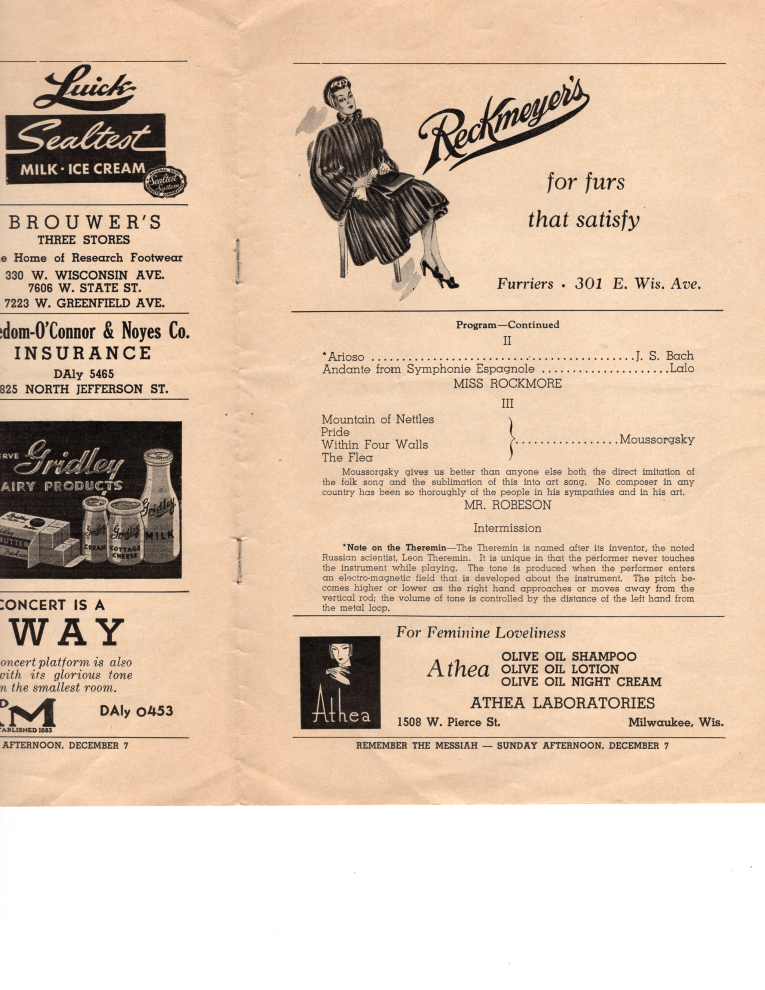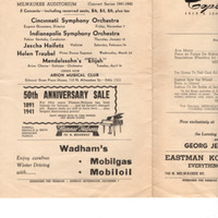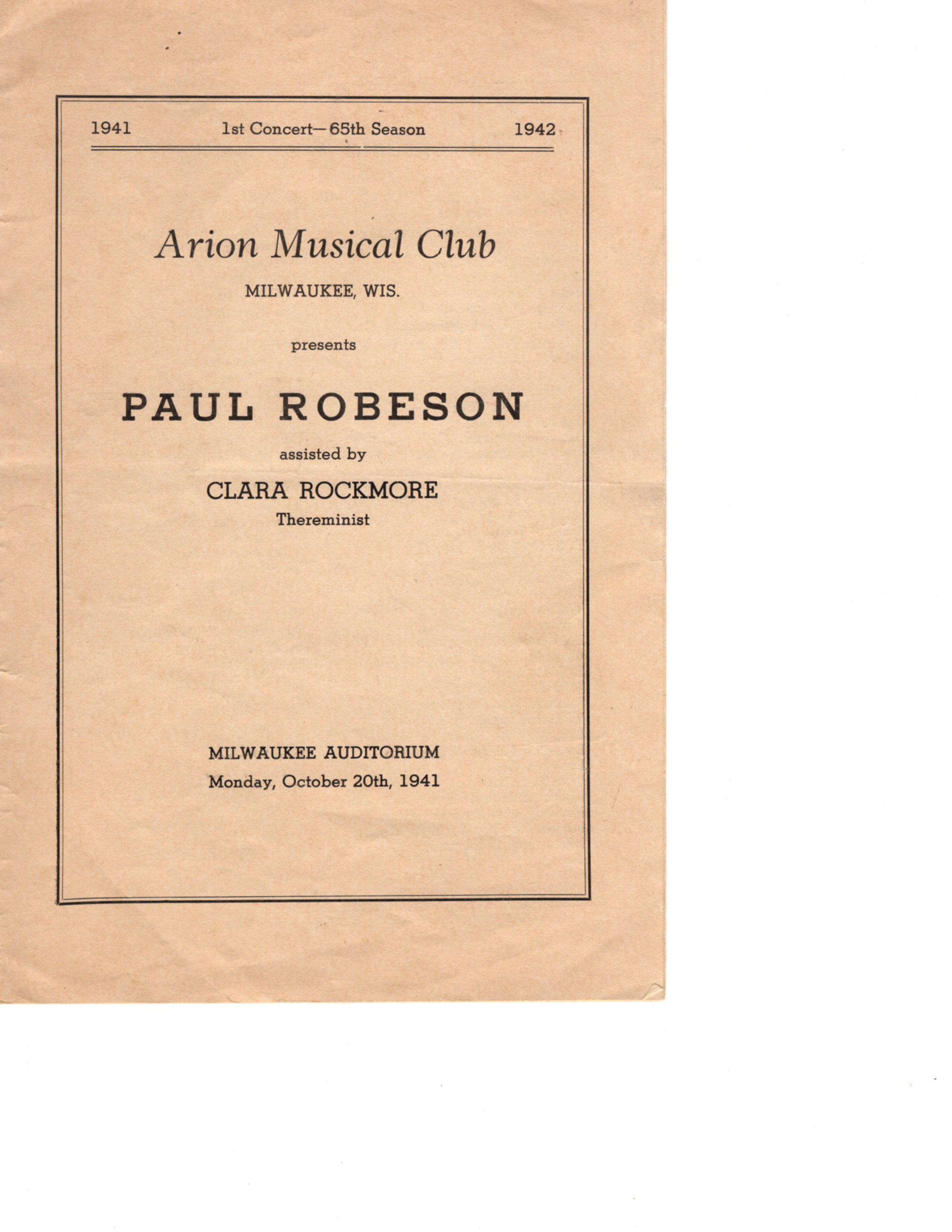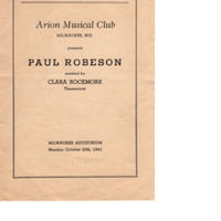 Vintage program for performances of Clara Rockmore & Paul Robeson. Presented by Arion Musical Club. Performance took place at the Milwaukee Auditorium in Milwaukee, WI on Monday, October 20th, 1941.