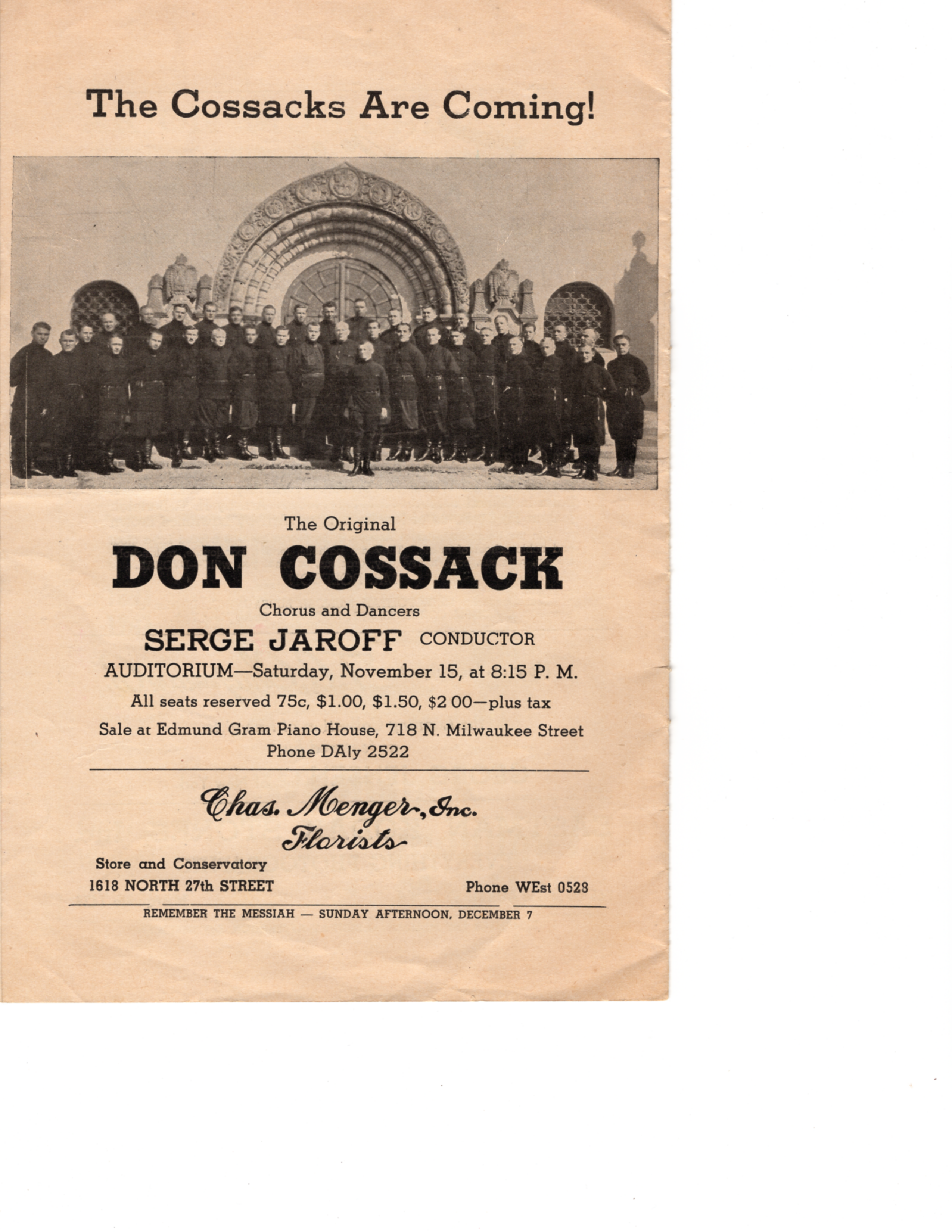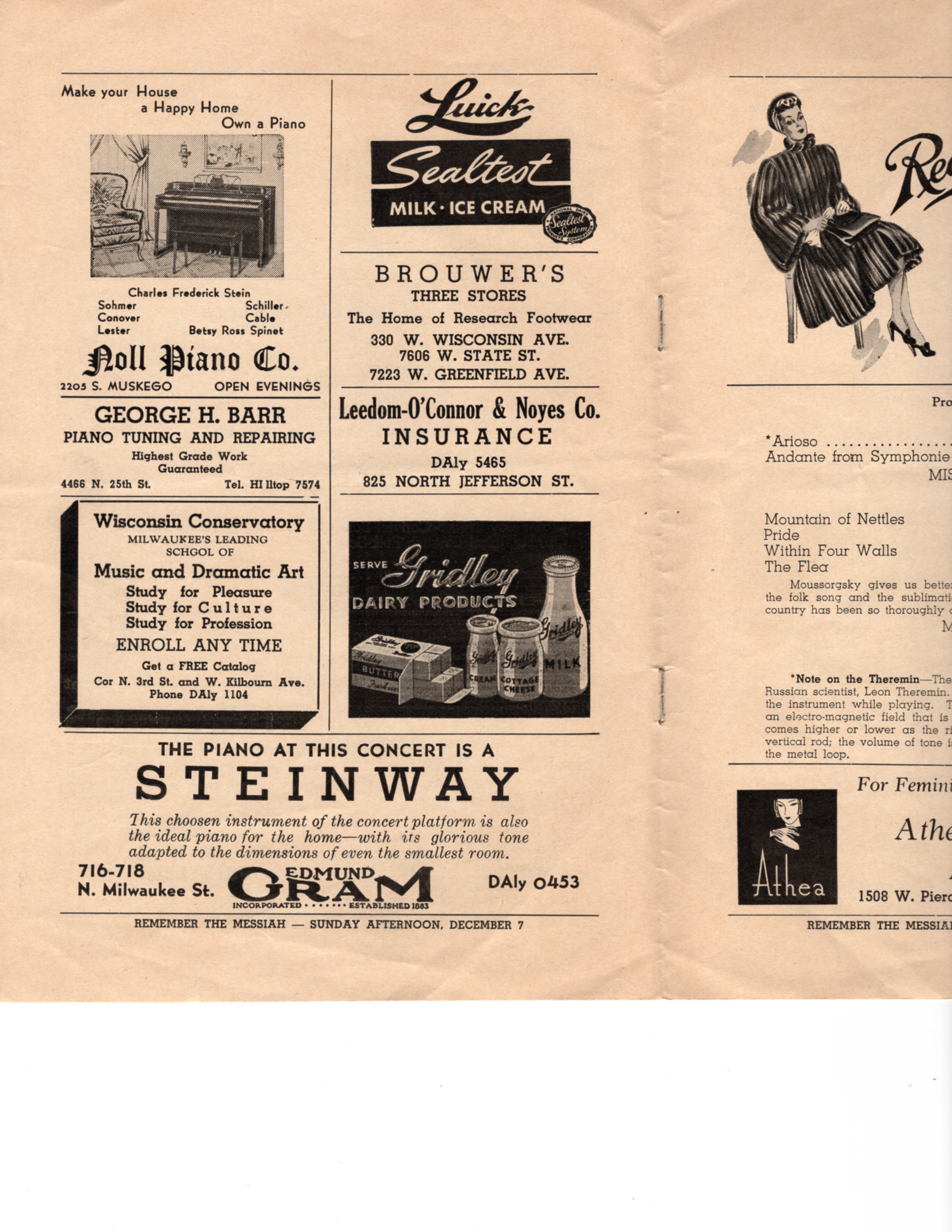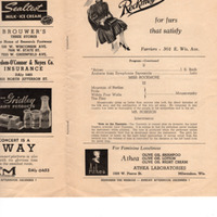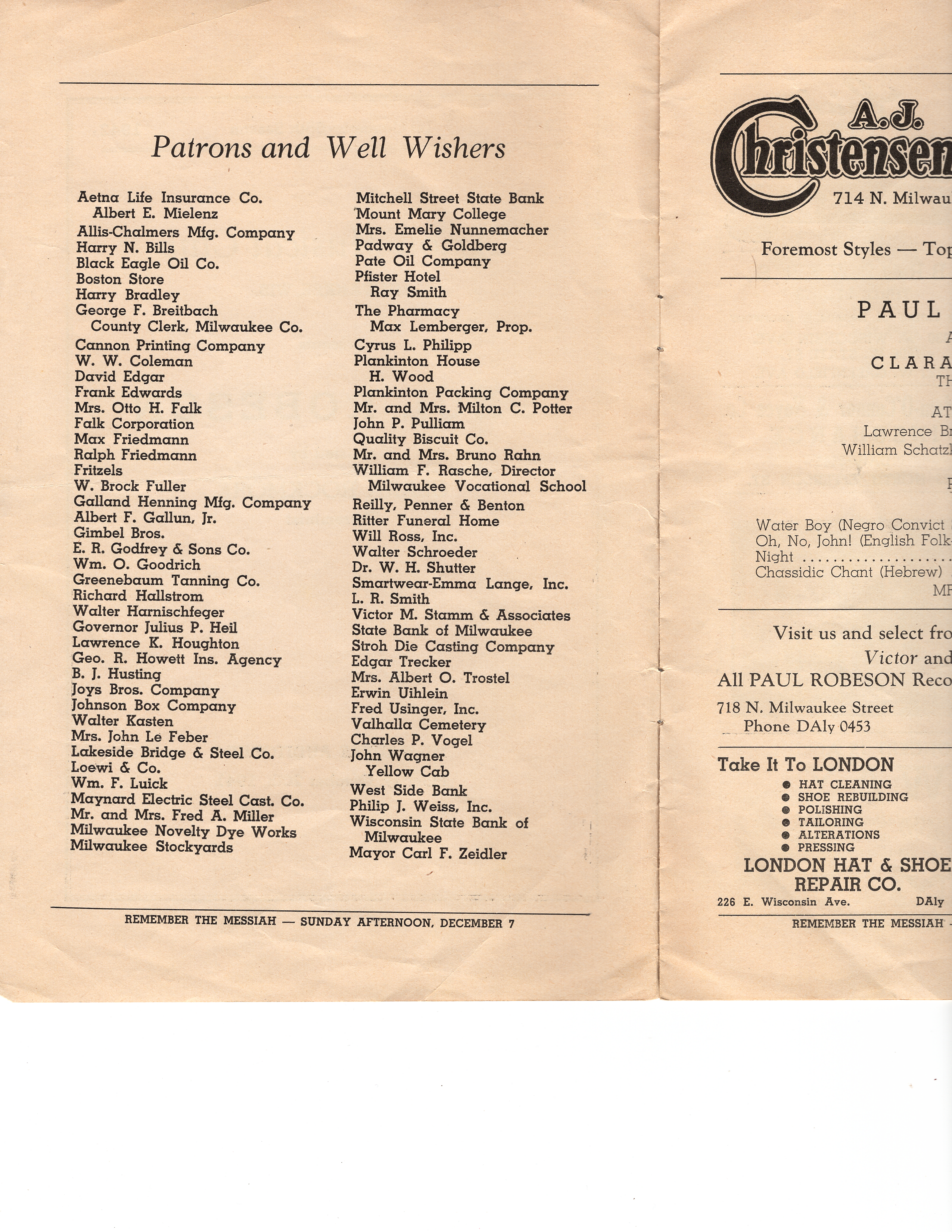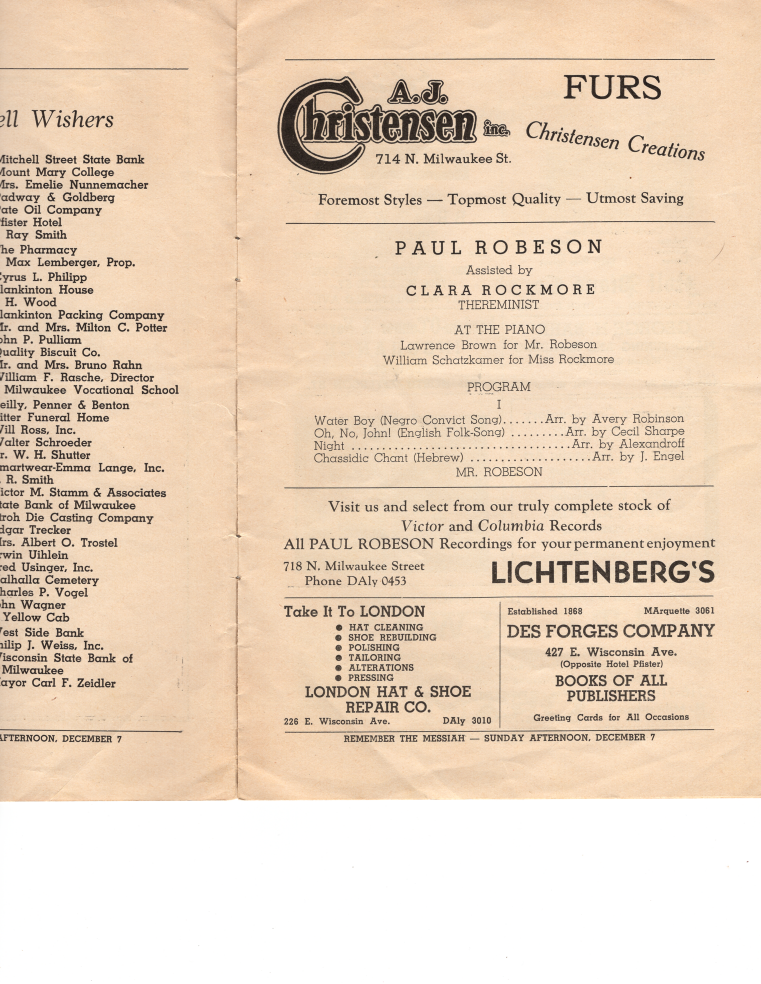Vintage program for performances of Clara Rockmore & Paul Robeson. Presented by Arion Musical Club. Performance took place at the Milwaukee Auditorium in Milwaukee, WI on Monday, October 20th, 1941.