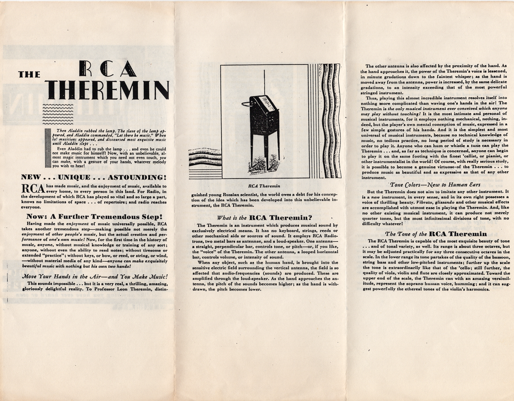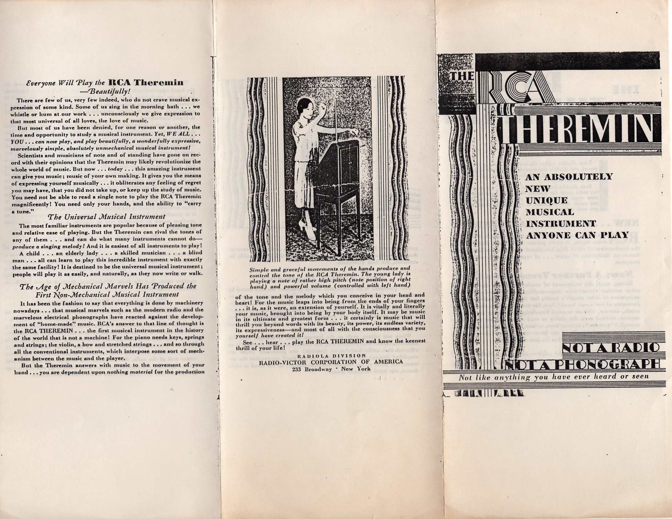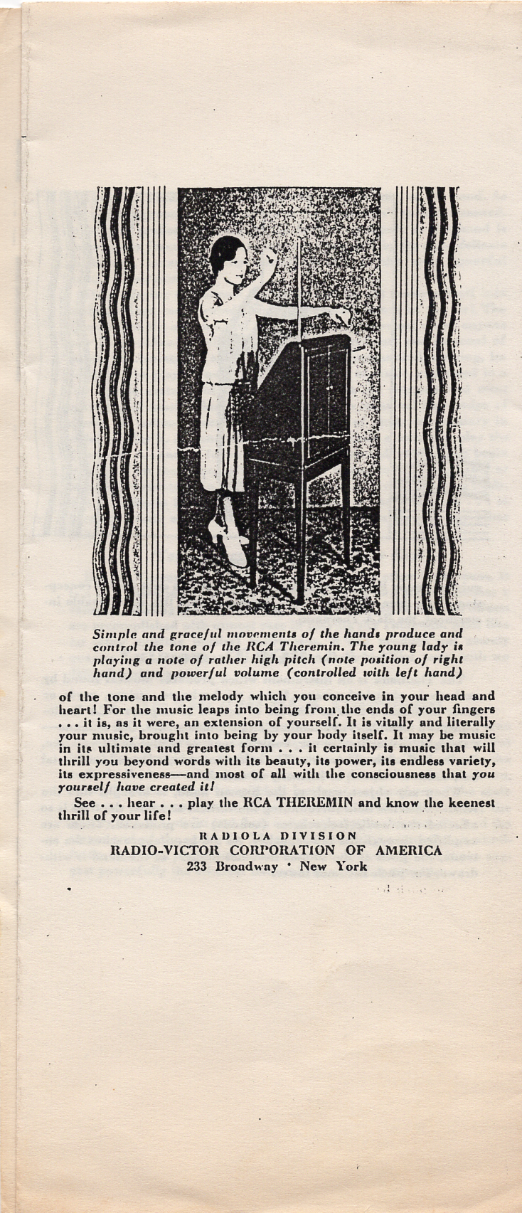 It has been the fashion to say that everything is done by machinery nowadays... that musical marvels such as the modern radio and the marvelous electrical phonographs have reacted against the development of “home-made” music. RCA’s answer to that line of thought is the RCA Theremin... the first musical instrument in the history of the world that is not a machine! For the piano needs keys, springs, and strings; the violin, a bow and stretched strings... and so through all the conventional instruments, which interpose some sort of mechanism between the music and the player.