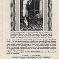 The RCA Theremin is capable of the most exquisite beauty of tone... and of tonal variety, as well. Its range is about three octaves, but it may be adjusted practically for any three consecutive octaves in the scale. In the lower range its tone partakes of the quality of the bassoon, string bass, and other low-pitched instruments; further up the scale the tone is extraordinarily like that of the ’cello; still further, the quality of viola, violin, and flute are closely approximated. Toward the upper end of the scale, the Theremin can, with an amazing verisimilitude, represent the soprano human voice humming; and it can suggest powerfully the ethereal tones of the violin’s harmonics.
