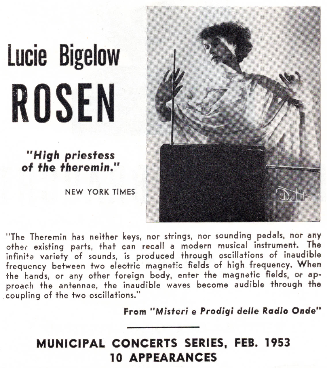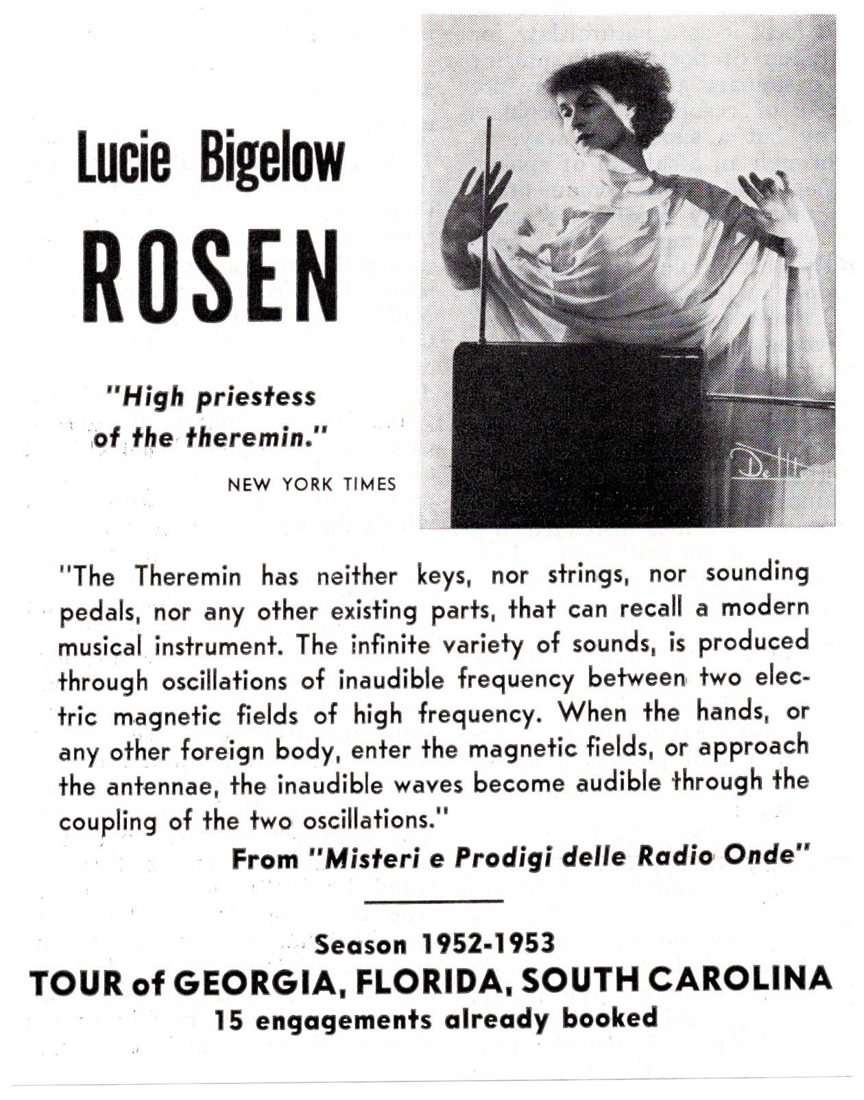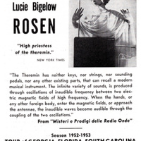"High priestess of the theremin." — These are two advertisements clipped from newspapers/flyers that advertise Lucie Bigelow Rosen's performances specifically from 1952-1953. Both cut-out ads feature the same photo of Rosen very majestically playing her theremin with the exact same quote from "Misteri e Prodigi delle Radio Onde" which basically translates to the fascinating phenomena of radio waves.