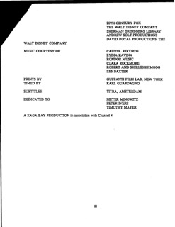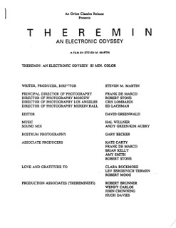 These are original credits from the 1993 documentary THEREMIN: An Electronic Odyssey and were made possible to scan from the film's original press kit. You may try to recognize a few names such as Clara Rockmore, Brian Wilson, & Leon Theremin.